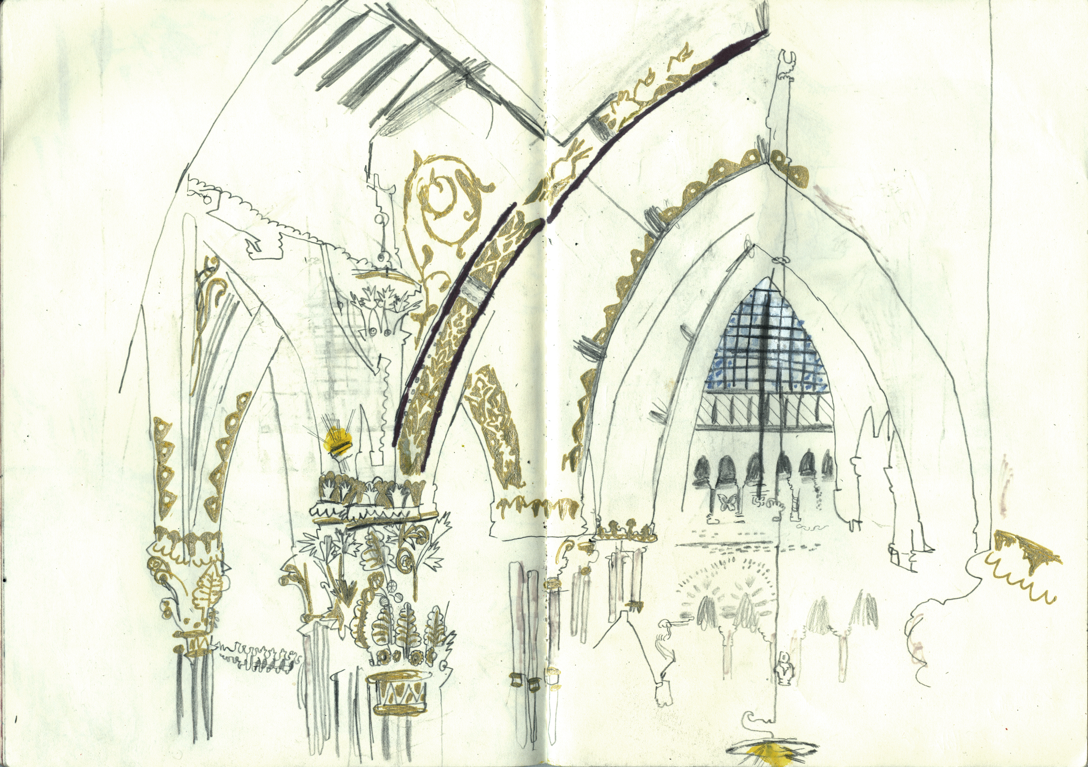 A Grade 1 neo-Gothic building the Museum of Natural History crosses between a medieval church and elegant greenhouse. Its all high archways and pillars; stone and metal; expanses of glass and bright light. It is simply awe-inspiring. The main hall’s breadth spans four large archways, which repeat along its length curving to the glassy ceiling. The supporting pillars are made of several varying individuals- some narrow, some more rotund. Crowning these is a burst of pods, flowers and leaves, reaching curly tendrils ahead. Overall it gives the impression of something alive, unfurling and growing. There’s plenty of gold too, with even the iron arches hosting golden patterns. It’s a kind of Garden of Eden- something celebrated- elegant and grand. Corridors surround each floor and comprise a row of miniature archways each with a different pillar of polished stone and a plaque detailing it’s name and whereabouts: the building plays as exhibit too! Display cases mimic the architecture with their slanted roofs and pale wooden frames. They sit in rows as greenhouses in an allotment. Light dances and bounces on the panes in wiggles, bowed lines and pregnant shapes whilst spotlights disperse star-like reflections.